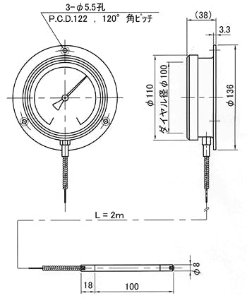●メーカー…佐藤計量器製作所●型番…VB-100P●材質…ケース:6ナイロン+ガラス、感温部:Cut・Niメッキ●感温部サイズ…φ8×100mm●リード長…2m●測定範囲…0~120℃●1目盛…5℃●ダイヤル径…100mm●ケース外径…110mm●取付ねじ無し(投げ込み型)●蒸気圧式