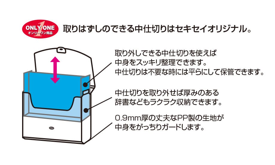 ●メーカー…セキセイ(sedia)●型番…AP-956●材質…PP●サイズ…340×60×260mm●色…ブラック●仕様…A4判●取りはずしのできる中仕切り付●中仕切りをはずせば辞書も入るワイドなマチ幅60mm!●「抱える」「取っ手を持つ」2wayの使い方ができる新機能取っ手●角が丸くて手に優しい形状のケースです。●使いやすいワンタッチ止め具。●耐荷重5kgでもOK。
