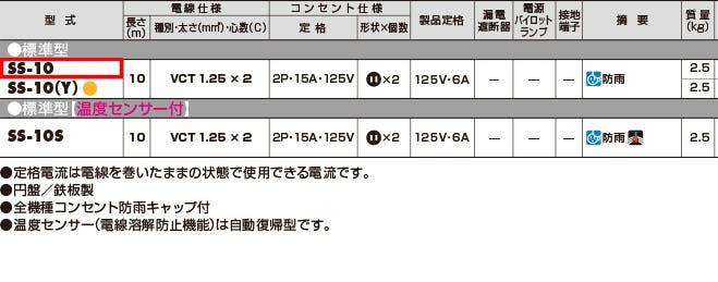 ●メーカー…ハタヤリミテッド(HATAYA)●型番…SS-10●コンセント数…2個●コンセント定格…2P・15A・125V●許容電流…15A●電線仕様…VCT1.25m平方m×2心●防雨型●コード長…10m●重量…2.5kg
