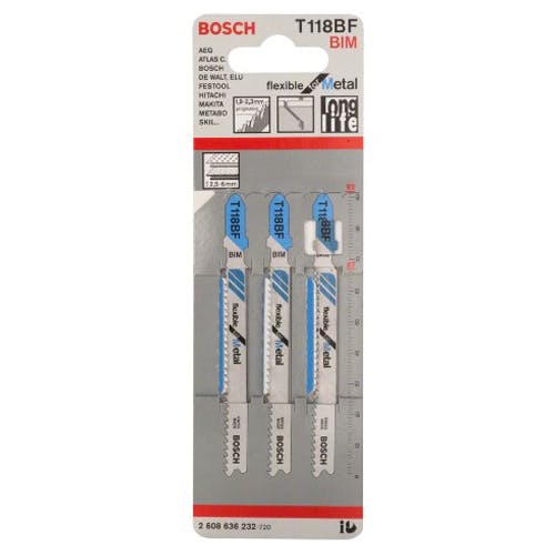 ●メーカー…ボッシュ●型番…T-118BF/3●全長(mm)…92●山数…11~13●シャンク…Tシャンク●入数…3枚●用途…ステンレス2.0~3.0mm、軟鋼板2.5~6.0mm●刃厚(mm)…1.0●有効長(mm)…67●材質…バイメタル●切断タイプ…直線切断●金工用折れにくいバイメタルブレード