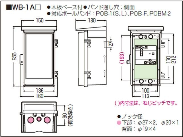 ●メーカー…未来工業●型番…WB-1AJ●取付スペース…ELB:3P・30A×1、配電箱:なし●材質…ABS樹脂●バンド通し穴幅…27mm●屋根、扉は本体と分離可能●タテ型●サイズ…256×160×130mm●有効深さ…90mm●防雨型●木板ベース付●屋根付●カラー…ベージュ