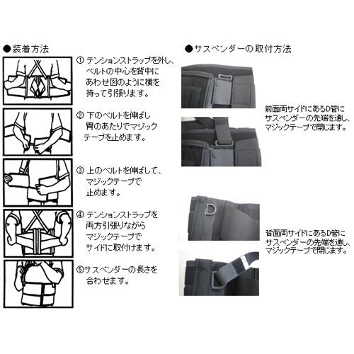 ●上下、2枚の布と3枚目の伸縮性の布が腰をしっかり固定します。●独特のデザインでバックストレスを軽減します。●サスペンダーはマジックテープ止、取外し自在です。●サイズ…L●腰回り…122~147cm●重量…400g