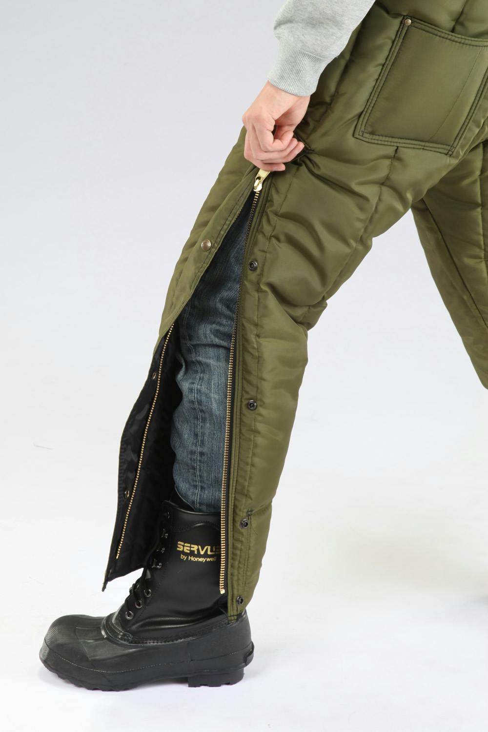 ●材質…ナイロン、ポリエステル●420デニールで強靱性があり、防風・防水素材を布地内側に使用。●適応温度…約-45℃●ゆったりしたポケットが3つ付いています。●前はボタンとジッパーのダブル開閉タイプ●サイドもボタンとジッパー開閉タイプ。はきやすさを考慮してジッパーが上部まで上がります。●サイズ…2XL