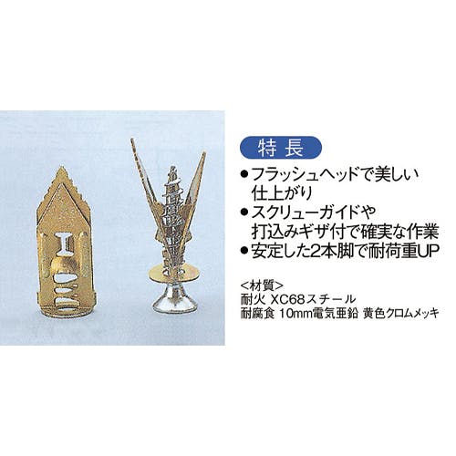 ●固定板厚(mm)…3~13●適合ねじ径(mm)…3.5~5●下穴…不要●適合ねじ長…25mm以上●入数…10●材質…耐火XC68スチール、耐腐食 10mm電気亜鉛 黄色クロムメッキ●特長…フラッシュヘッドで美しい仕上がりスクリューガイドや打込みギザ付で確実な作業安定した2本脚で耐荷重UP●付属品…皿ビス(4.5×30mm)●下穴不要で取付け時に粉やゴミが出ません。●ビス有