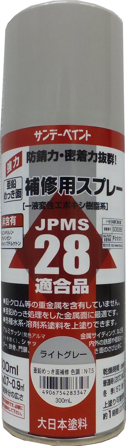 ●塗り面積(1回塗り)…0.7~0.9m2●乾燥時間(指触)…20℃:約15分冬期:約1時間●アルミサッシ、シャッター、鉄骨、門扉など屋外の鉄部や亜鉛メッキ面の防錆に●内容量…300ml●使用温度範囲…常温●色…ライトグレー