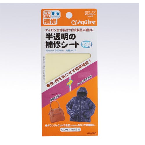 ●メーカー…クロバー(Clover)●型番…68-080●カラー…半透明●材質…基材:ポリウレタンフィルム粘着剤:アクリル系剥離紙:紙●幅…70mm●長さ…300mm●重量…13g●入数…1枚●表から補修する衣類やバッグなどに補修跡がテカらず、目立ちにくいシートです。●ナイロンやポリエステル製の衣類、光沢のない合皮製品の補修に便利です。