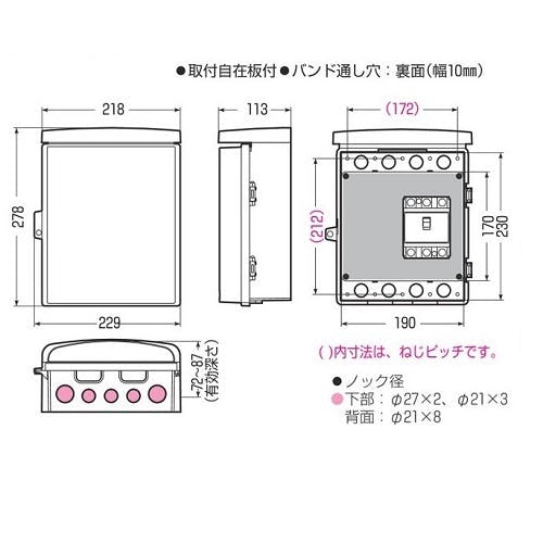 ●メーカー…未来工業●型番…WB-11DM●取付スペース…ELB:3P・60AF×1●材質…ABS樹脂●カラー…ミルキーホワイト●ヨコ型●バンド通し穴…巾10mm(裏面)●サイズ…278×229×113mm●有効深さ…76~86mm●重量…860g●常設に適したスッキリデザイン●器具の取付位置自在。取り外し可能な樹脂製基台を採用。●防雨型●本体と屋根は一体型です。