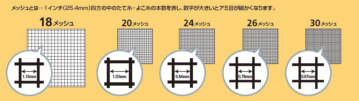 ●長さ…6m●材質…耐候性ポリプロピレン●カラー…グレー●耐候性に優れる網戸用防虫網●高メッシュ品は防虫性、低メッシュ品は通気性に優れます●幅…910mm●目合…26メッシュ