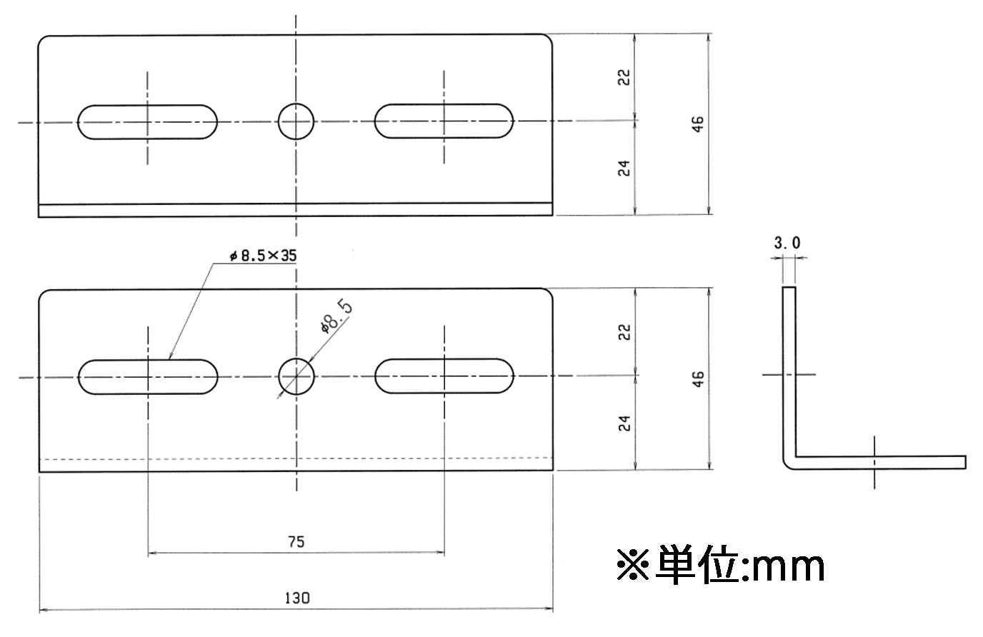 ●材質…ステンレス(SUS304)●全長…130mm●幅×幅…46×46mm●厚み…3mm●長穴数…4●穴数…2●長穴サイズ…8.5×35mm●穴径…8.5mm●重量(1個あたり)…約280g●入数…1個●取付ねじ無し