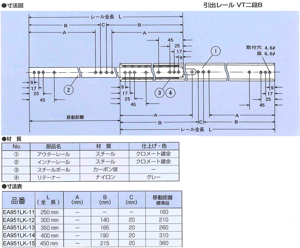●全長…350mm●耐荷重…10kg●移動距離…260mm●材質…レール:スチール(クロメートメッキ)スチールボール:カーボン球リテーナー:ナイロン●用途…引出しの制作に●付属品…ブラケット、鋲(2個)●取付ねじ無し●底付用
