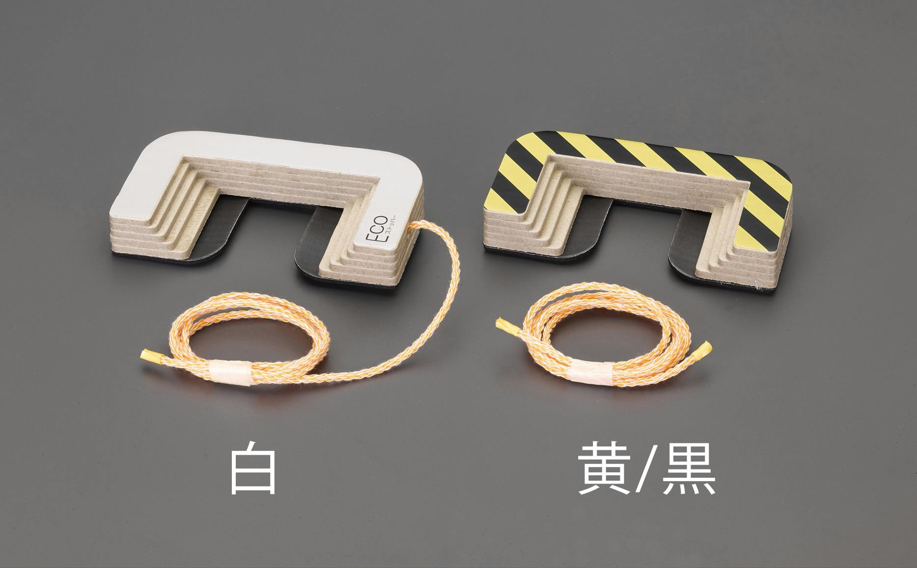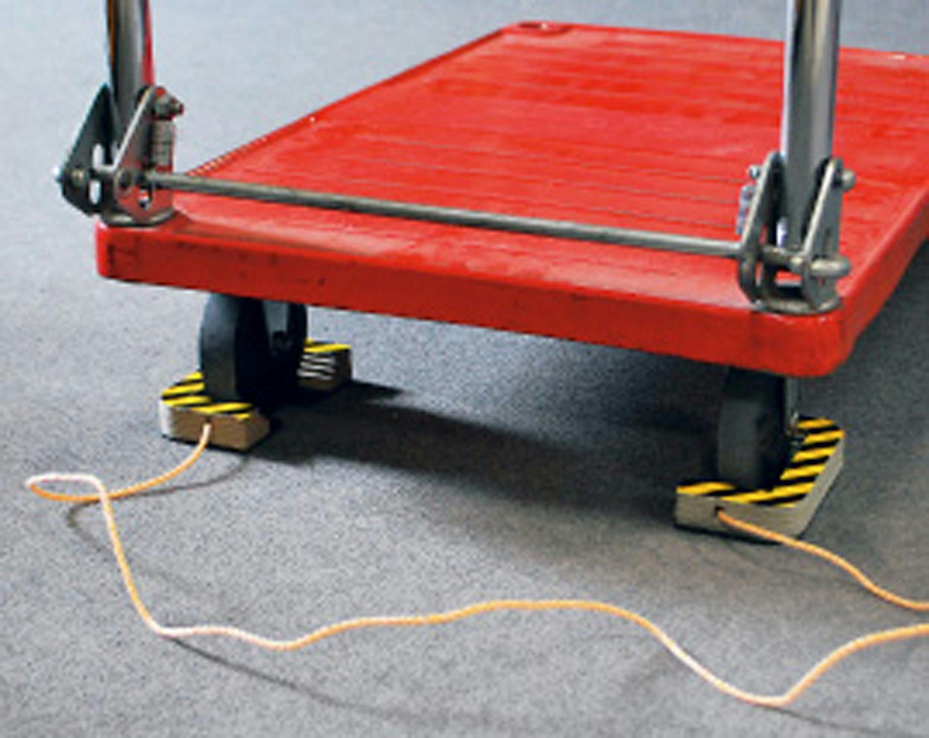 ●台車の車輪止めに●材質…本体:ペーパーボード(再生紙)、すべり止め:ウレタンゴム●使用可能床面…フローリング、カーペット、タイル●ひも付●車輪サイズ…100mm用●カラー…黄/黒