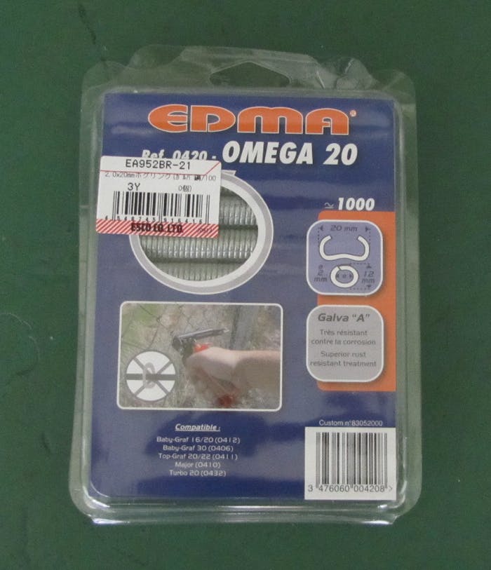 ●メーカー…EDMA(エドマ)●型番…042001●材質…ガルバ鋼●かしめ内寸…8mm●入数…約1000個●線径×全長…φ2×20mm●内径…8mm●金網やフェンスの取り付け、補修に
