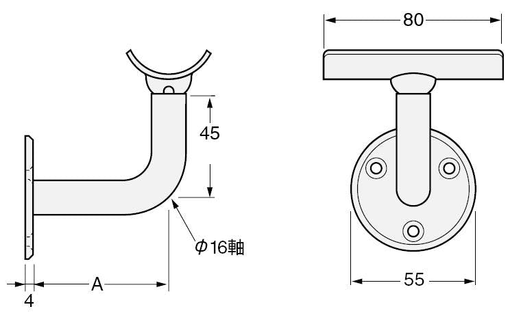 ●用途…階段手すりや落下防止など●材質…ステンレスSUS304●適用手すり径…32mm●出幅A…58mm●手すり受け部…80mm●軸径…16mm●ベース径…55mm●付属品…木ネジ●首振り傾斜対応タイプで、階段などの傾斜部分でも施工が簡単です。●ヘアーライン仕上げ(つやを消し、金属的な質感が強調されている為、高級感があります。)●木ねじ3.8×32、3本