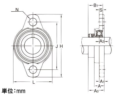 ●メーカー…旭精工●型番…MUFL004●呼び番号MUFL形…004●軸径(mm)…20●サイズ(mm)…H:90、L:55、A:16、J:71、N:10、A1:8、A2:8、A0:26.5、B1:24.5、S:6●材質…本体:亜鉛合金ダイカストボール:ステンレス鋼●円筒穴形●ステンレスシルバー