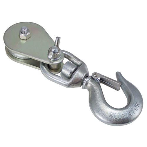 ●材質…鉄鋳物●使用荷重…675kg●車径…50mm●使用ロープ径…~9.5mmまで●全長…197mm●重量…210g●フック口開き…26mm●スイベル式(360°回転)