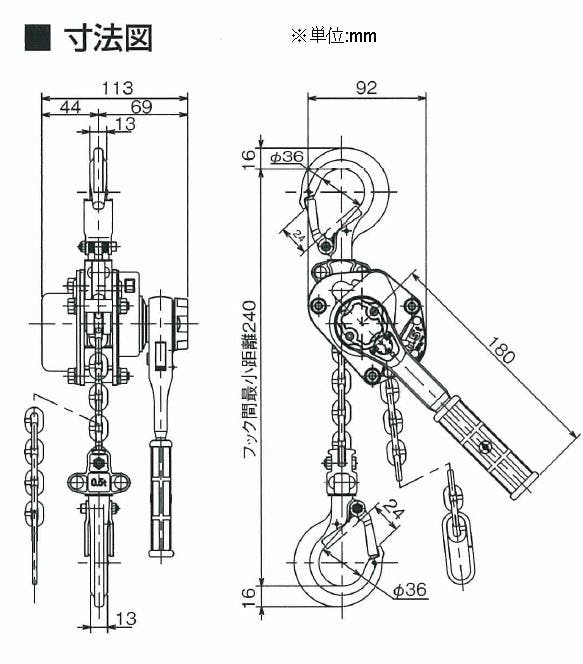 ●使用荷重…0.5t●最大巻取長…5m●重量…3.7kg●フック間最小距離…240mm●手巻力量…363N(37kg)●ロードチェーン…線径:4.3mm、掛数:1●フック口開き…24mm●逆転ツマミで、揚程を瞬時に調整できます。●本体の姿勢にかかわらず確実に目的の長さにチェーンを調整できる強制遊転方式