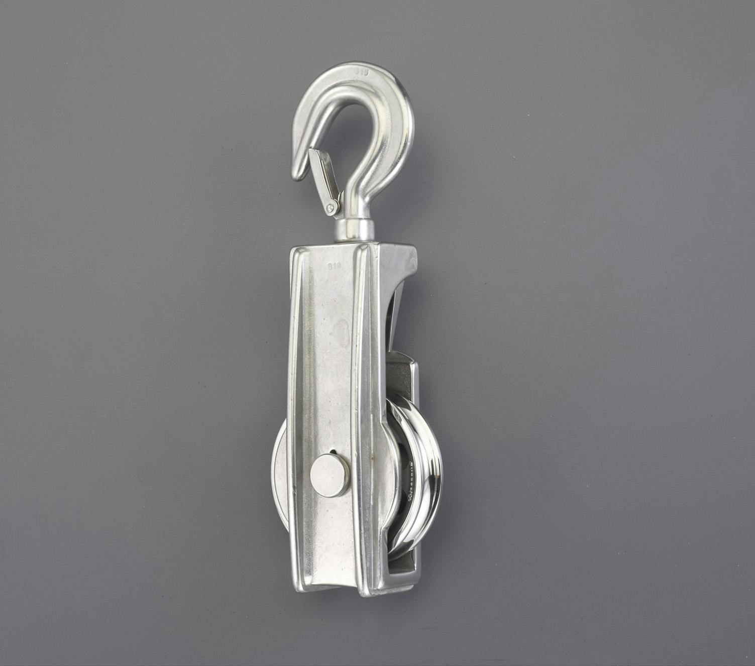 ●使用荷重…680kg●使用ロープ径…~12.7mm●車径…76mm●全長…240mm●重量…1.5kg●材質…ステンレス(SUS316)●フック口開き…18mm●スイベル式(360°回転)●ロープ用