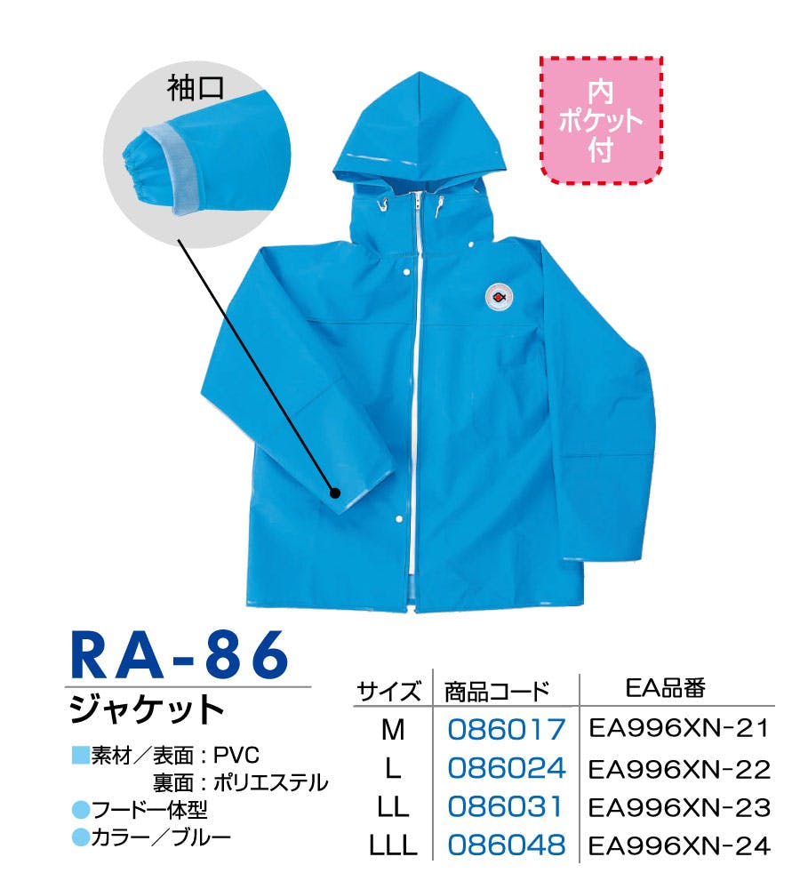●材質…表:ポリ塩化ビニール、裏:ポリエステル●袖口2重仕様●フード取外不可(フード一体型)●サイズ…M●適応サイズ…身長:162~168cm 胸囲:84~92cm