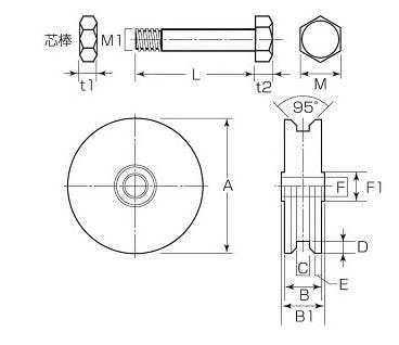 ●材質…車:ステンレス(SUS303)●密閉防塵ベアリング…1個●芯棒付●車輪径×幅(A×B)…110×24mm●軸径(F)…12mm●サイズ…B1:28mm、C:10.5mm、D:8.0mm、 E:4.6mm、F1:20mm、L:45mm、 M:19mm、M1:M12、t1:7mm、 t2:8mm