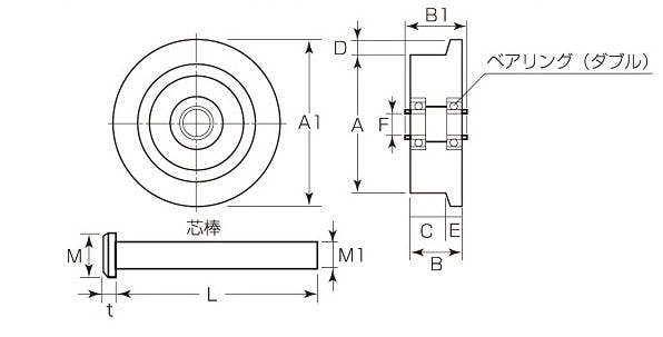 ●材質…車:ダクタイル鋳鉄●密閉防塵式ベアリング2個●芯棒付●サイズ(A×B)…130×43mm●フランジ径(A1)…150mm●軸径(F)…20mm●サイズ…B1:48mm、C:33.0mm、D:10.0mm、 E:10.0mm、L:100mm、M:30mm、 M1:M20、t:13.0mm●重量…3.30kg