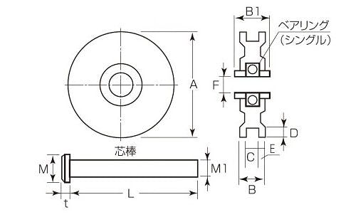 ●車輪径×幅(A×B)…75×25mm●軸径(F)…13mm●サイズ…B1:30mm、C:7.5mm、D:6mm、E:8.7mm、L:75mm、M:φ19mm、M1:φ12.9mm、t:4.0mm●材質…車:ダクタイル鋳鉄●重量…0.55kg●密閉防塵式ベアリング1個●芯棒付