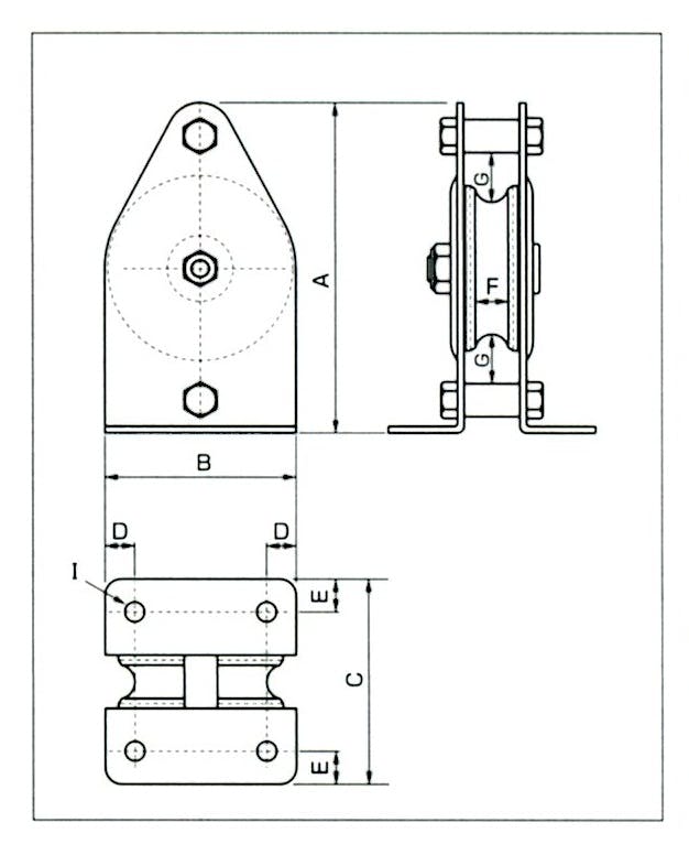 ●メーカー…スリーエッチ●型番…VM50●使用荷重…125kg●車径…50mm●使用ロープ径…~8mm●サイズ… A:100mm、B:58mm、C:62mm、D:9mm、 E:10mm、F:10mm、G:15mm、I:6.5mm●重量…380g●材質…鉄●軸受…メタル●荷役搬送作業やロープガイドとして。