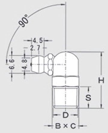 ●形状…90°●ねじサイズ(D)…M6×P0.75●全長(H)…19.5mm●ねじ長(S)…6mm●六角対辺(B×C)…10mm●重量…8.7g●材質…本体:SUS303、ボール:SUS304、スプリング:SUS304●ステンレス製のため、耐久・耐食性に優れています。●六角対辺…10mm