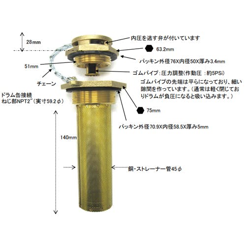 ●ねじサイズ…2"NPT●FM規格適合品●材質…真鍮●火炎防止装置付●重量(g)…900g●●FM規格…Factory Mutualの略で、1835年に設立された民間の防火、防爆機器に関する試験、認証機関で、認証のためにFM規格の作成と発行を行っています。アメリカ合衆国とカナダで適用される規格です。