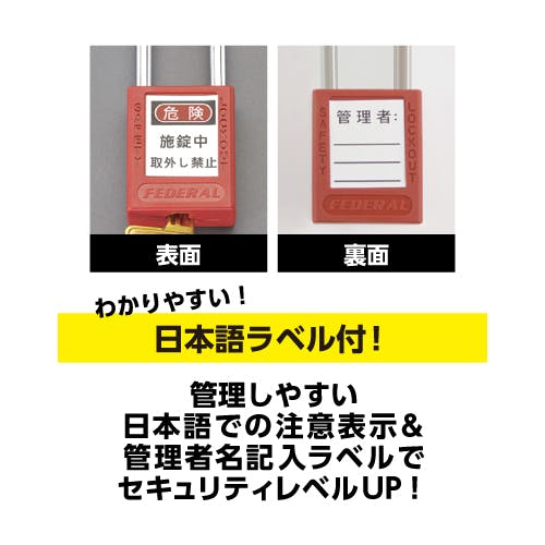 ●幅(mm)…38●ツル径(mm)…6.35●クリアランス(mm)…タテ:76ヨコ:19●材質…本体:プラスチックツル:スチールシリンダー:真鍮●色…黒●本体高さ…46mm●本体厚み…19mm●鍵1本付●ロックアウト用●★裏面に管理者名を記入することで、セキュリティレベルを上げることができます。●日本語表記ラベルのロックアウト用南京錠●4色展開で識別に便利