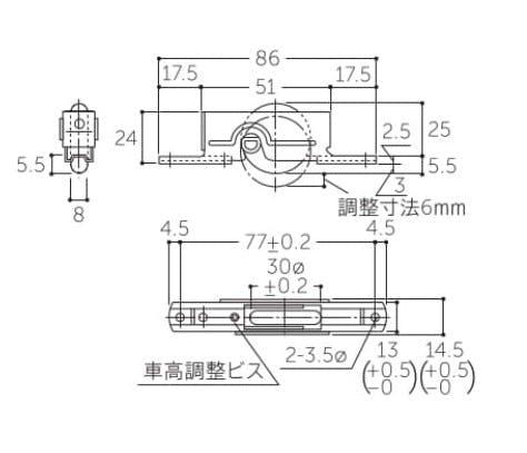 ●仕様…鉄枠平型●耐荷重(2個)…15kg●掘込みサイズ…長さ:51mm幅:14.5mm深さ:26mm●材質…車:ウレタン枠:鉄(クロメート仕上)●付属ネジ…皿タップピンネジ 3.0×20●入数…1個●車高調整付(調整方向:上下)6mm