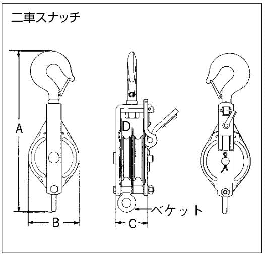 ●メーカー…スリーエッチ●型番…175×2SO●材質…スチール●重量…17.5kg●全長…490mm●使用荷重…3t●使用ロープ径…20mm●車径…175mm●サイズ…A:490mm、B:190mm、C:120mm、D:22mm、G:35、H:50●べケット付●2車●オーフスナッチタイプ●スイベル式(360°回転)