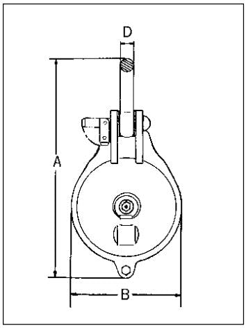 ●メーカー…スリーエッチ●型番…YB150×1●重量(g)…5100●材質…スチール●重量…5.1kg●全長…350mm●使用荷重…2t●使用ロープ径…~14mm●車径…150mm●サイズ…A:350mm、B:176mm、D:22mm●上部を開くとロープの途中からでも装着可能です。
