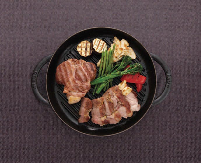 ●電磁調理器IH200V、オーブンにも使えます。●熱伝導性、保温性の高いグリルです。●グリル内部のザラザラ加工により、油なじみがよくなり、焦げ付きを防げます。●山形に刻まれた溝が余分な油を落とします。●※電子レンジ使用不可