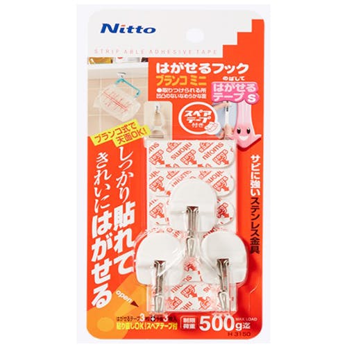 ●メーカー…ニトムズ●型番…H3150●耐荷重(kg)…0.5●面サイズ(mm)…22×29●口幅(mm)…15● 材質…本体:ABS樹脂、フック:ステンレススチール、粘着材:合成ゴム系●入数…30個●色…白●振り幅があるブランコタイプフックで、天井に取り付けての使用もできます。●フック部は錆に強いステンレス素材です。●壁面にしっかり貼れてきれいにはがせます。●スペアテープ付