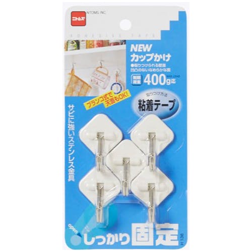 ●メーカー…ニトムズ●型番…H136●耐荷重(kg)…0.4●面サイズ(W×H)mm…32×32●口幅(mm)…14●材質…本体:スチロール樹脂フック:ステンレススチール粘着剤:合成ゴム系●入数…50個●粘着タイプ●フックが前後にスイングするので、カップなど幅のあるものを掛けるのに最適です。●フック部は錆に強いステンレス素材です。