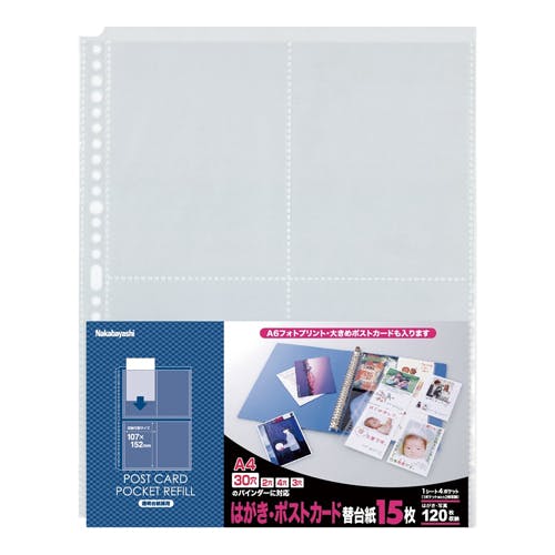 ●メーカー…ナカバヤシ●型番…BPR-10N-N●サイズ(mm)…302×234●収納可能サイズ…152×107mmはがき×4ポケット●規格…A4●重量(g)…150●入数…15枚●材質…ポリプロピレン●上入れ●片面収納●増えても安心!はがきが片面に4枚並べて入る替台紙です。●30穴・2穴・3穴・4穴に対応したマルチホールシステムを採用したA4サイズの替台紙●29穴(30穴、2穴、3穴、4穴兼用)