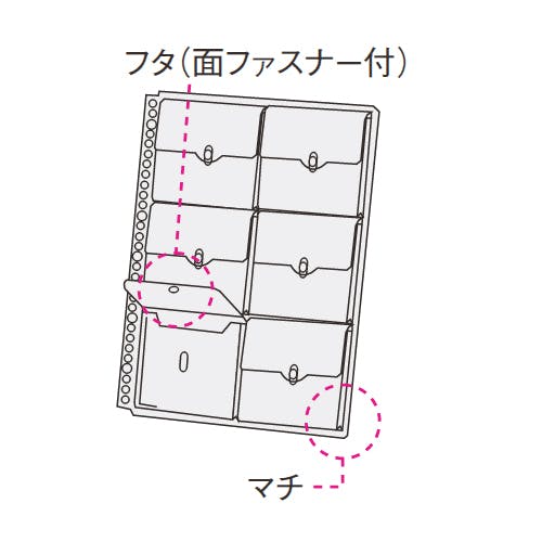 ●メーカー…ライオン事務器(LION)●型番…14734●ポケット…6個●サイズ(mm)…300×230●ポケットサイズ…92×106mm●入数…2枚●材質…PP●A4判●両サイドと底にマチがあるので厚みのある立体物の収容が可能です。●ふたは面ファスナーで固定でき、収容物の落下を防ぎます。