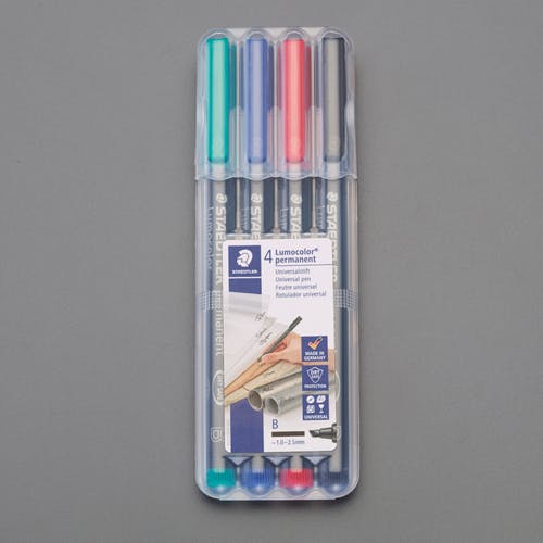 ●メーカー…ステッドラー(STAEDTLER)●型番…314 WP4●インク色…黒、赤、青、緑●入数…4本●線幅…1.0~2.5mm●線幅記号…B●太字●優れた定着性と耐光性により、CD-R・DVD・陶器・金属・ガラスなどにマーキング出来るペンです。●ドライセーフインクを使用している為、キャップをはずしたままでも、2日間ペン先が乾きません。