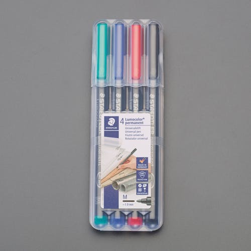 ●メーカー…ステッドラー(STAEDTLER)●型番…317 WP4●セット内容…黒、赤、青、緑●入数…4本●線幅…0.8~1.0mm●線幅記号…M●細字●優れた定着性と耐光性により、CD-R・DVD・陶器・金属・ガラスなどにマーキング出来るペンです。●ドライセーフインクを使用している為、キャップをはずしたままでも、2日間ペン先が乾きません。