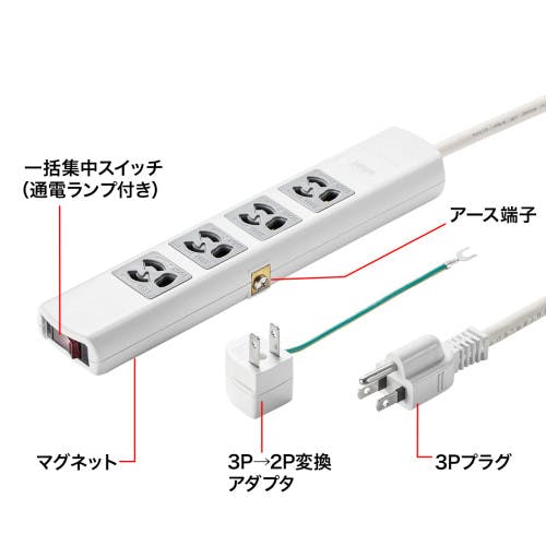 サンワサプライ タップ(4口/3P/一括スイッチ/抜止) AC125V/15Ax3m EA815GM-331 4518340100640【別送品】