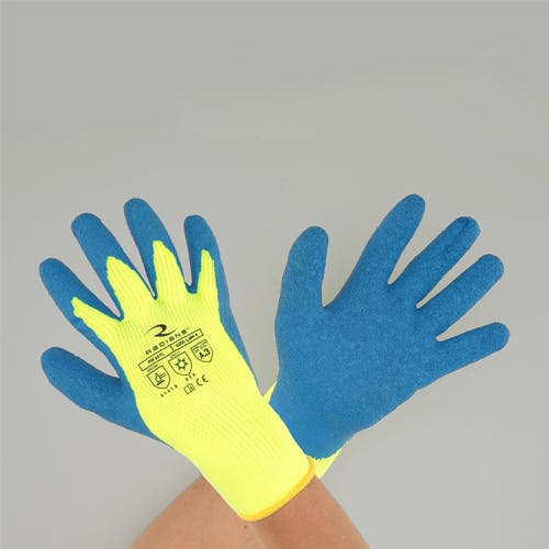 ●サイズ…M●全長(mm)…250●掌周り(mm)…220(Lサイズ)●中指長さ(mm)…85(Lサイズ)●材質…繊維:ポリエステル、樹脂部:ラテックス●厚み…2.0mm●カラー…蛍光イエロー、ブルー●7ゲージ●ラテックスコーティングにより、優れたグリップ力を発揮します。●袖口は伸縮性があり、アクリル80%、ポリエステル20%の裏地で保温性に優れています。●ANSI/ISEA 耐切創レベルA3