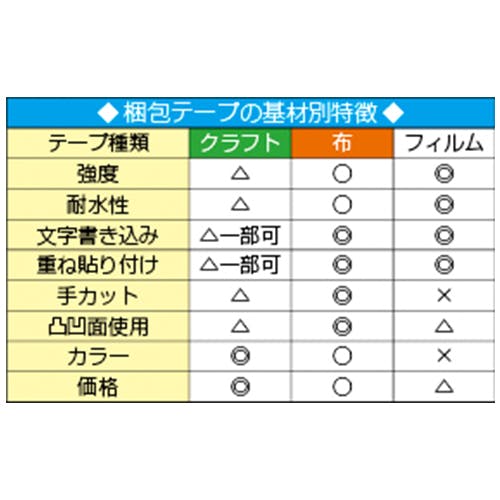●幅(mm)…50●長さ(m)…50●厚さ(mm)…0.14●色…黄●入数(巻)…1●材質…基材:クラフト紙粘着剤:ゴム系●内芯径…76mm(3”)●粘着力…3.3N/10mm●タック…ボールNo.12●展開力…0.5N/10mm●保持力…0mm●引張強度…60N/10mm●伸度…8.0%●白い特殊クラフト紙を使用し、色鮮やかな発色を実現したクラフトテープです。●紙の素材で軽くて、使いやすいです。●識別に便利
