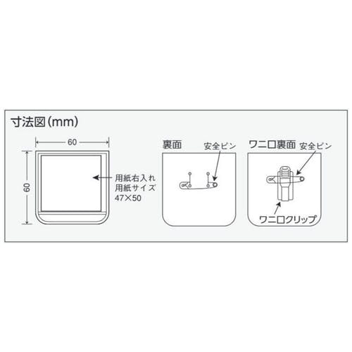 ●メーカー…ユニット(UNIT)●型番…368-131●サイズ…60×60mm●カラー…イエロー●材質…軟質ビニール●重量…9g●付属品…記入用紙1枚(47×50mm)●スポンジ入、安全ピン、ワニ口付●自作表示が差込めます。●表示が差替可能