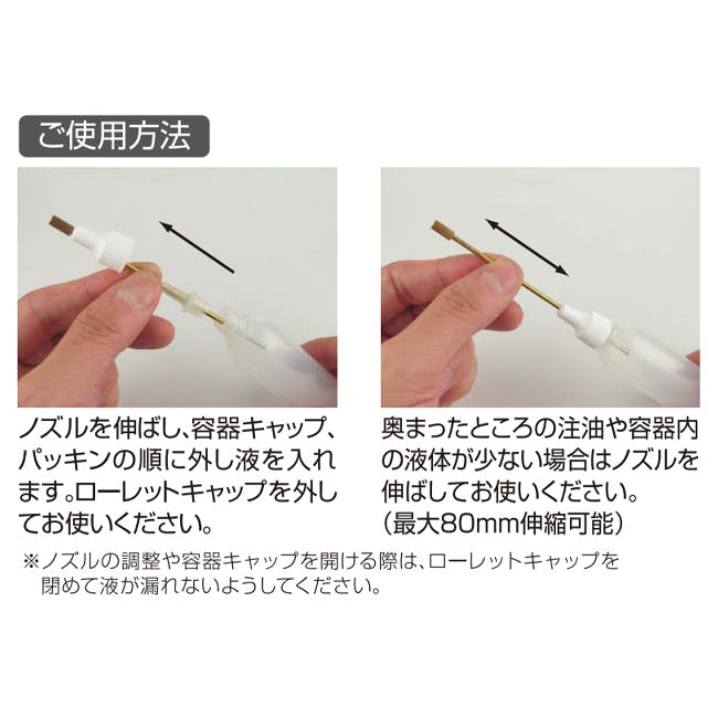 ●メーカー…エンジニア●型番…ZC-19●用途…機器の注油作業にパーツ作動部の潤滑に●容量…25ml●ノズル長…80mm●サイズ…φ25×104mm●重量…8.2g●材質…本体:LDPEキャップ:PPパッキン:PEノズル:真鍮●携帯に便利なコンパクトサイズです。●ノズルは伸縮できるので、奥まった箇所への注油に便利です。●オイル、クリーナー、水などの液体に使用できます。