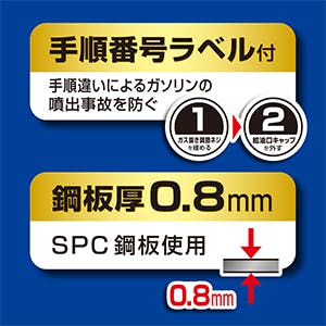 ●メーカー…大橋産業(BAL)●型番…No.1653●容量…20L●サイズ…430.5(W)×307.5(D)×257.5(H)mm●入数…1台●材質…SPC(冷間圧延鋼板)●鋼板厚…0.8mm●重量…3.2kg●付属品…給油ノズル、内容物表示ラベル●消防法適合品、UN規格適合品●農機や建機などのガソリン補充用に●給油手順違いによるガソリンの噴出事故を防ぐ手順番号ラベル付●丈夫な金属製給油ノズル口金●給油時に注ぎやすいように底面形状を工夫●内容物の揺れを抑える防波構造