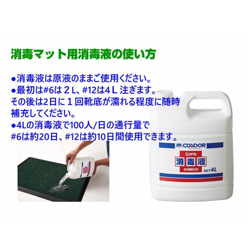 ●メーカー…山崎産業(CONDOR)●型番…C108-04LX-MB●内容量…4L●標準使用量…原液使用●成分…水分、塩化ベンザルコニウム、防カビ剤配合●用途…コンドル消毒マット専用液●消毒マット(EA997RE-61、-65、-66用)専用液●マットとセットでご使用ください。●環境ホルモン不使用●省スペース・減容容器