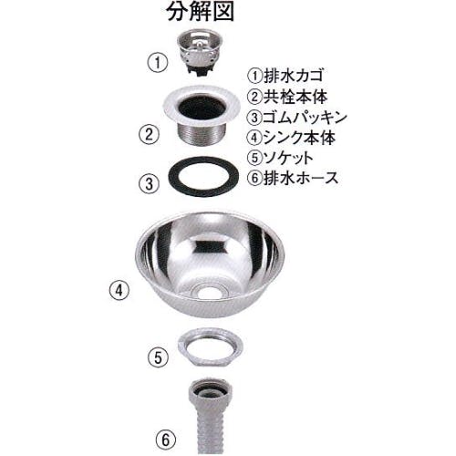 ●呼…40●シンクサイズ(mm)…内径:φ270外径:φ293●深さ(mm)…104●材質…ステンレス(18-8)●こちらの商品は、シンク本体のみです。●3枚目分解図:排水栓(1、2、3、5)はEA468DC-20B、ホース(6)はEA468LA-1(G1.1/2”x0.7m [ねじ込式]流し台用ホース)~EA468LA-5(G1.1/2”x2.0m [ねじ込式]流し台用ホース)となります。