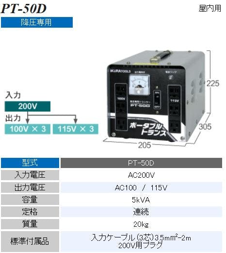 ●メーカー…育良精機●型番…PT-50D●容量…5kVA●定格…連続●入力電圧…AC200V●出力電圧…AC100V、AC115V●出力コンセント数…100V・115V×各3個●使用場所…屋内用●入力ケーブル…3心(3.5m平方m)×2m●本体サイズ…205(W)×305(D)×225(H)mm●重量…20kg●付属品…・200V用プラグ・入力ケーブル●用途…降圧専用