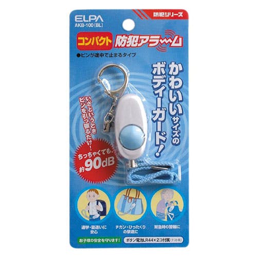 ●メーカー…朝日電器(ELPA)●型番…AKB-100(BL)●使用電池…アルカリボタン電池LR44×2個(テスト用付属)●電池寿命…アラーム連続 約50分●音量…約90dB/50cm●本体サイズ…(約)49(H)×24(W)×21(D)mm●重量…約23g(電池含む)●カラー…ブルー●ピンが途中で止まる(ピン抜け防止)タイプ●コンパクトサイズ●緊急時の警報に