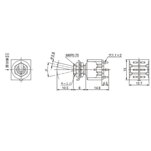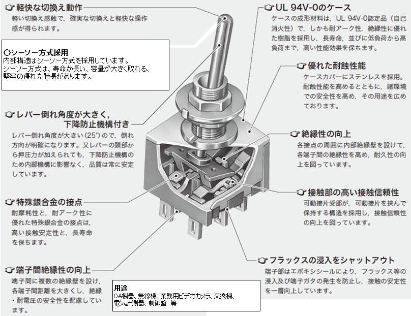 ●メーカー…NKKスイッチズ●型番…M-N23S1S●極数…2極双投●スイッチ特性…ON-OFF-ON●接点容量…6A 125V AC3A 250V AC3A 30V DC●パネルカット…6.5mm●端子形状…ハンダ端子●接触抵抗…10mΩ以下●接点仕様…銀●使用温度範囲…-30~85℃●操作部形状…基本レバー●パネル取付方法…ねじ取付け●パネル取付穴寸法目安…φ6.5mm●取付可能パネル厚目安…最大5.5mm●スイッチ特性の〈 〉はモメンタリになります。